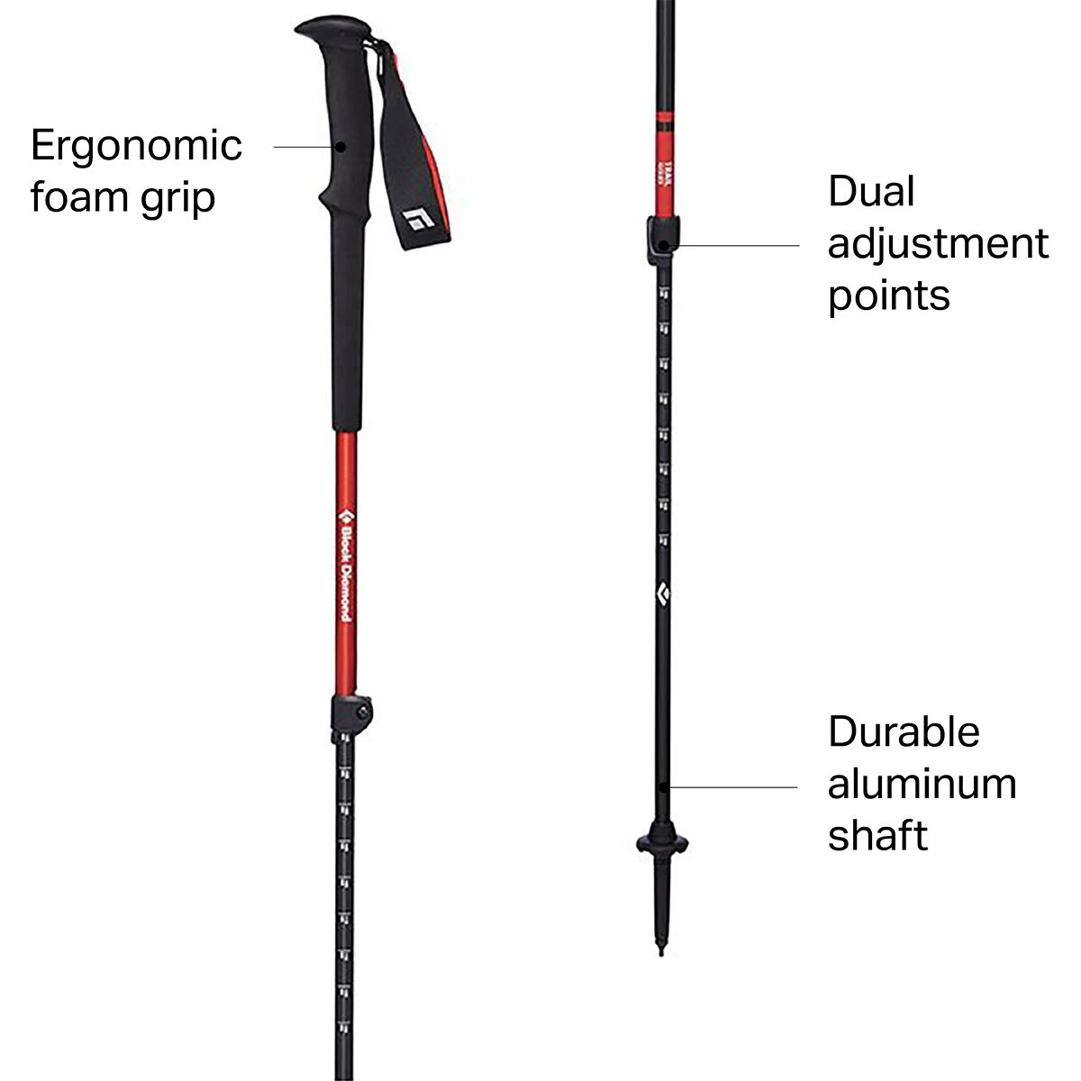 With the Trail Trekking Poles, Black Diamond strikes a perfect balance between comfort and reliability, now with an updated grip that’s softer than ever. These versatile poles will help you stay upright on the trail, balanced on the skin track, and planting turns on the ski slopeโ with interchangeable carbide tech tips, low-profile trekking baskets, and wide powder baskets (sold separately). The Double Flicklock extension system is simple, reliable, and has a low-profile design to improve swing weight, while the padded strap, soft foam grip allow you to hold on all day without developing carpal tunnel or having to smash your piggy bank to afford new poles.