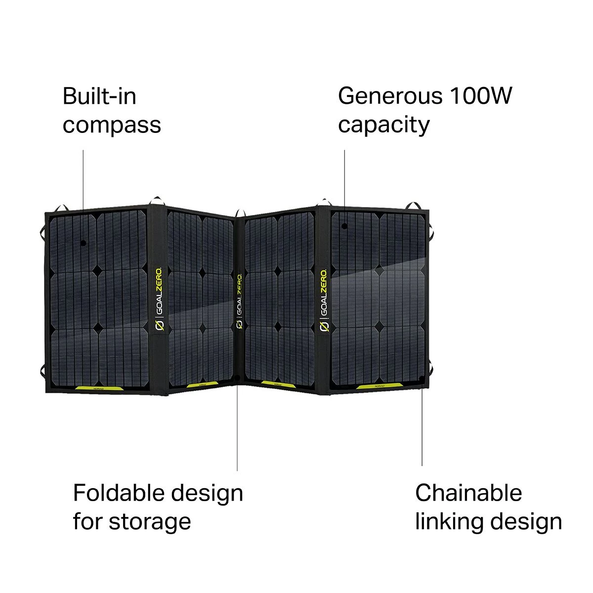 - 100W capacity charges Goal Zero Yeti 800 in about 8 hours